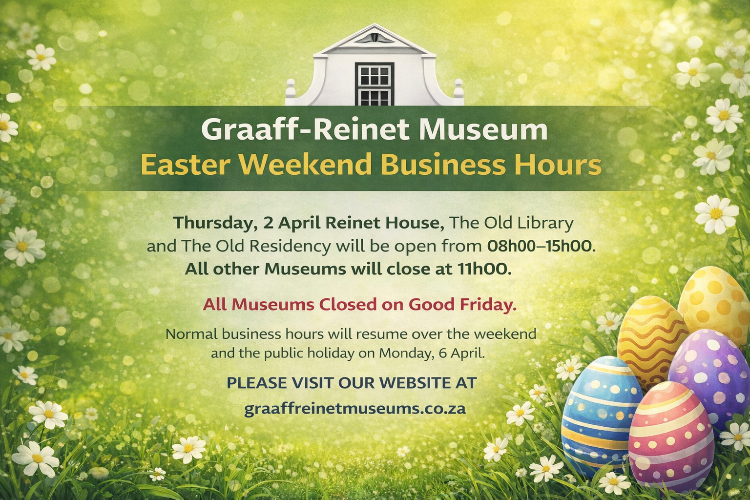 πΏ Easter Weekend Trading Hours | Graaff-Reinet Museum πΏ Please take note of our adjusted hours over the Easter period: Thursday, 2 April Reinet House, The Old Library & The Old Residency: 08h00 β 15h00 All other museums: Close at 11h00 Good